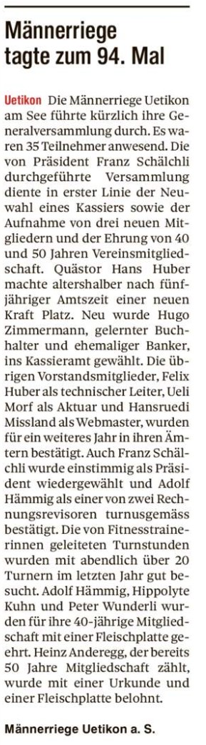 Unsere 94. Generalversammlung fand auch diese Jahr wieder im Restaurant Sonnenhof in Uetikon statt.