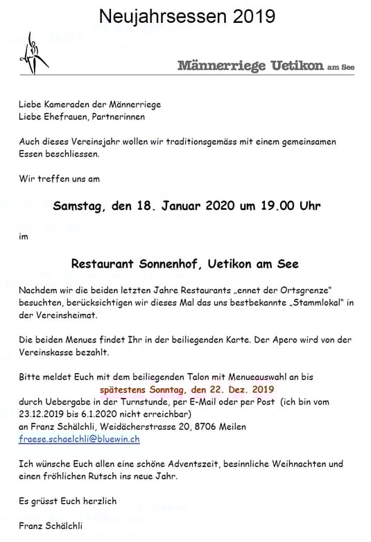 Am 18. Januar 2020 trafen wir uns für das diesjährige Neujahrsessen im Sonnenhof in Uetikon am See.