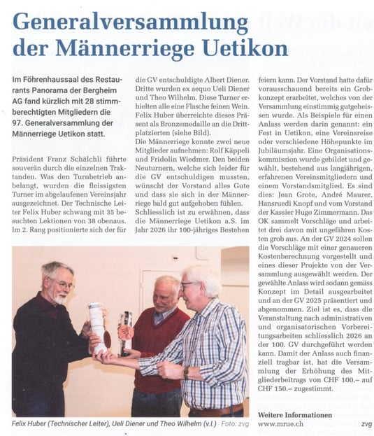 Zu unserer 97. MRUe-GV am 17. Februar 2023 trafen sich 28 Männerriegler wieder im schönen Föhrenhaussaal des Bergheims Uetikon.