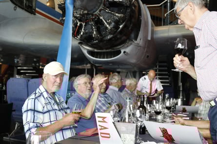 eine zweimotorige Propellermaschine. Darunter und rundherum sind die Tische angeordnet. Vor dem Nachtessen genossen wir ausgiebig den Apéro, spendiert von Erich.
