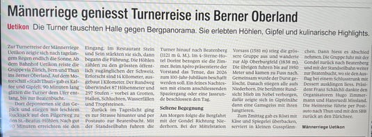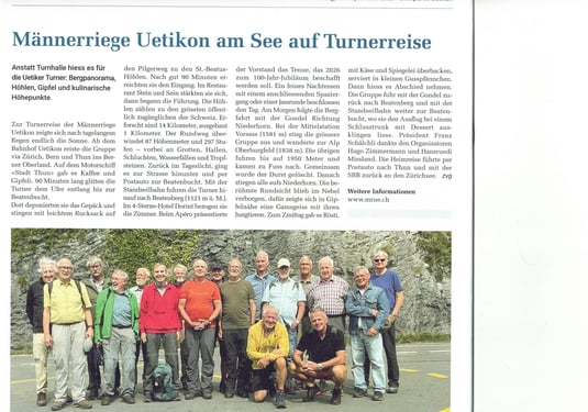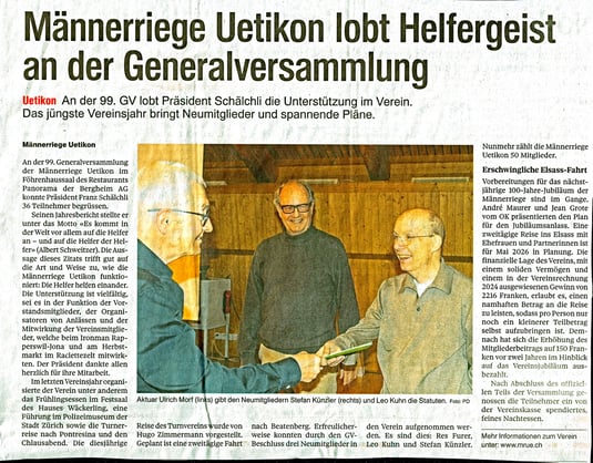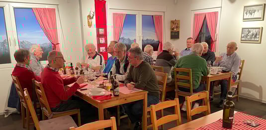 Die verschiedenen Traktanden wurden zügig erledigt: Wiederwahl des Vorstandes, Abnahme von Rechnung und Budget und auch die Wiederwahl von Revisor Franz B. Erfreulich war, dass wir drei Neumitglieder aufnehmen konnten (wovon 2 anwesend waren). Hugo stellte die diesjährige Turnfahrt ‘Beatenberg’ vor. André und Jean als Vertreter des OK ‘Jubiläumsreise 100 Jahre MRUe’ präsentierten die vorgesehene 2-tägige Reise ins Elsass im Mai 2026. Diskutiert wurde auch über ein neues oder geändertes Logo aus Anlass unseres Jubiläums im nächsten Jahr.