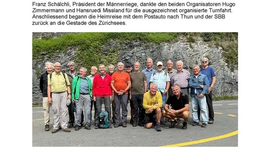 Es fanden sich 21 Mitglieder unserer Männerriege am frühen Nachmittag am Bahnhof Uetikon ein zur Fahrt mit dem Zug zum Flughafen, von wo uns ein Bus direkt zum Eingang des Rega-Center brachte.