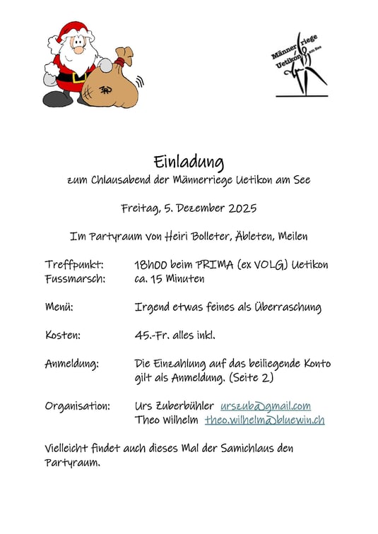 Im Partyraum von Heiri Bolleter hatten Theo und Urs, einmal mehr, einen stimmungsvollen Chlaushöck für uns Männerriegler organisiert. Bei der Ankunft gab es zum Aufwärmen den traditionellen Becher Punsch bevor wir an den mit Spanischen Nüssli, Schöggeli und Mandarinli reich geschmückten Tischen Platz nahmen.